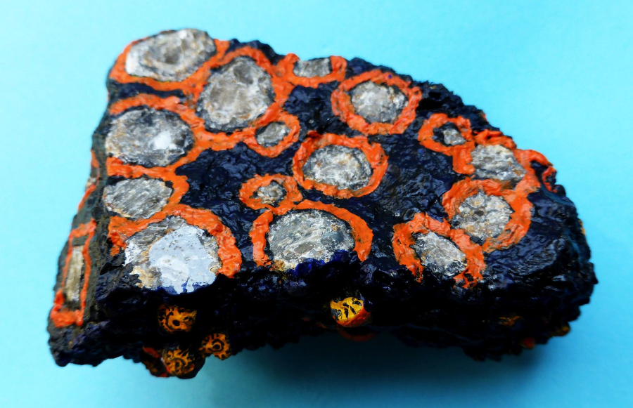 Fossiler Pop: Bemalter Trochitenkalk mit Trochiten auf der einen Seite