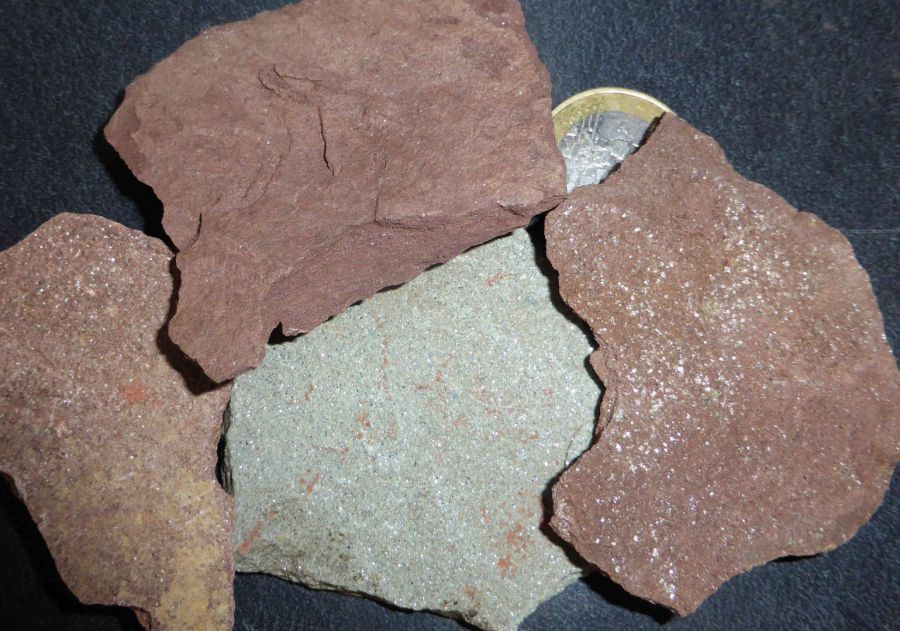 Ob grau oder rotbraun, der Plattensandstein ist und bleibt voller Glimmerplättchen. Der Glimmer ist nicht stark mit dem Sandstein verklebt. Die Glimmerplättchen lösen sich schnell. Ein Teil der Sandsteinoberfläche erscheint dann glimmerfrei.