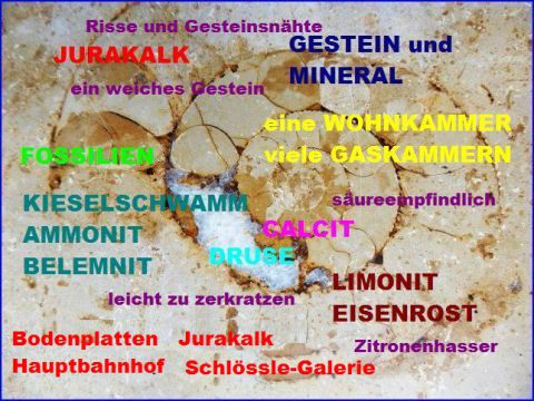 Das Erinnerungsblatt beansprucht nicht sehr viel Zeit. Es bleibt in seiner Museumsecke auf dem Boden zurück und verbringt dort die Mittagspause. Die Klasse hingegen nimmt auf den Stühlen Platz. Der Hammerjäger hat noch eine zweite Informationsrunde vorgesehen. Er stellt die drei Großfossilien vor, die einfach zu mir als Jurakalk gehören. Er beginnt mit den Ammoniten und ihren spiralförmigen Gehäusen.