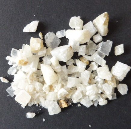 1. Die Streichholzschachtel wird auf dem Teller ausgeschüttet. Die Calcit-Brösel werden nach Rhomboedern durchsucht. Es sollen möglichst viele Rhomboeder auf ein Stück schwarzes Papier geklebt werden. Siehe weiter unten!