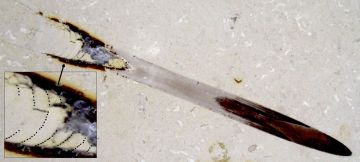 2. Das Bild von einem Belemnitentier wird eingeschnitten, gefaltet, mit einem Kalkkegel versehen und so aufgeklebt, dass der Kalkkegel beim Auffalten zu sehen ist. Siehe weiter unten!