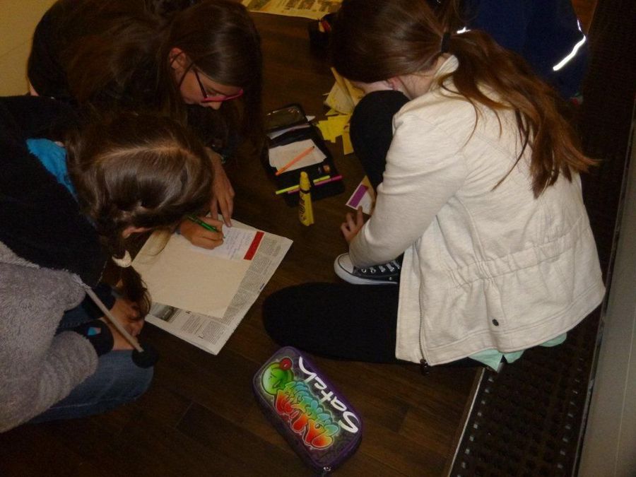 Eine Viertelstunde später ist die Klasse aber in der Schlössle-Galerie. Ich höre, wie der Hammerjäger auf mehreren Blättern Arbeitsaufgaben verteilt. Jetzt geht es darum, sich in Kleingruppen schnell im Gebäude zu orientieren, die Aufgaben zu lösen und noch einmal Punkte zu sammeln. Und es geht auch darum, zum Schluss noch ein bisschen Durchhaltevermögen zu zeigen. Das Vermögen wird gezeigt, was später nach der Auswertung der Aufgabenblätter hohe Punktezahlen eindrücklich beweisen! Im Folgenden ein paar der Aufgaben: