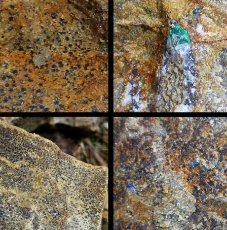 Die Kupferspuren, blauer Azurit und grüner Malachit, sind winzig und nur selten auf einem frisch frostgespaltenen Stein zu sehen. Aber sie lassen sich vermuten, wenn ein Dolomitstein wie dieser auf dem Weg liegt: grau-ockergelber Stein mit schwarz-grauen Flecken. Relativ häufig!