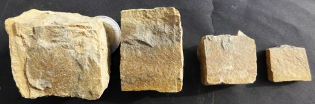 Der Hammerschlag auf einen Deckplatten-Dolo-mitstein lieferte diese vier Bruchstücke.